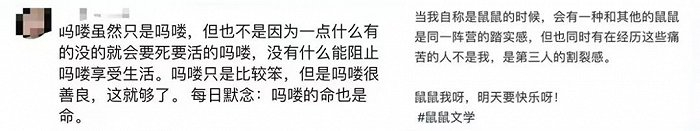 首先,这是年轻人进行自我表达的另类方式。当人太累了,年轻人开始纷纷化身为“精神动物”。面对生活压力,他们一边用吗喽、鼠鼠自嘲,表达反抗意识,一边又期望像水豚一样情绪稳定地接纳一切、佛系躺平,却对生活保留希望。