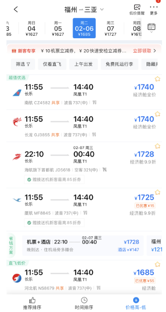 从明年1月中下旬开始,随着春运临近,福州出发的机票价格将逐步上涨。前期以返乡及热带避寒目的地为主,临近春节长假则以冬季滑雪、旅游热门目的地为主。国内一些热门航线的经济舱机票甚至已经售罄。2月6日,福州飞三亚经济舱价格已超1700元。