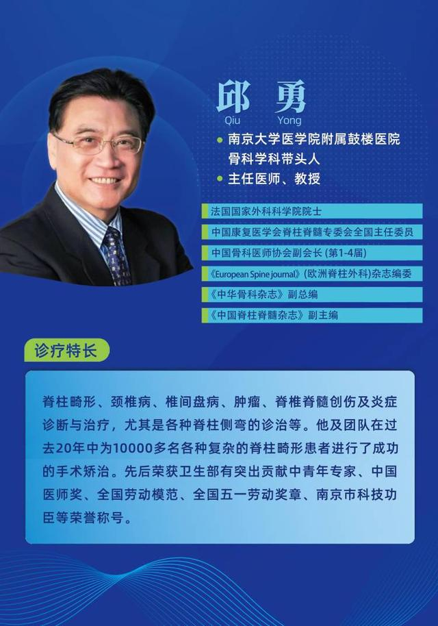 据介绍,南京鼓楼医院脊柱外科是掌握严重复杂脊柱畸形综合治疗策略的脊柱专科,目前共完成脊柱畸形矫治手术15000余例,现年脊柱畸形手术量近1000例。学科带头人邱勇教授为法国国家外科科学院院士,香港中文大学名誉教授,于2001年创建了江苏省首个脊柱外科,开展了脊柱侧凸的微创矫形。他及团队在过去20年中为10000多名各种复杂的脊柱畸形患者进行了成功的手术矫治。