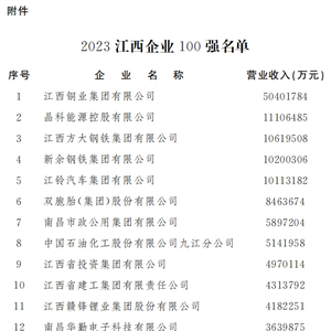 今天,江西省企业联合会、省企业家协会布了“2023江西企业100强”榜单及《2023江西企业100强发展报告》(以下简称《报告》)。