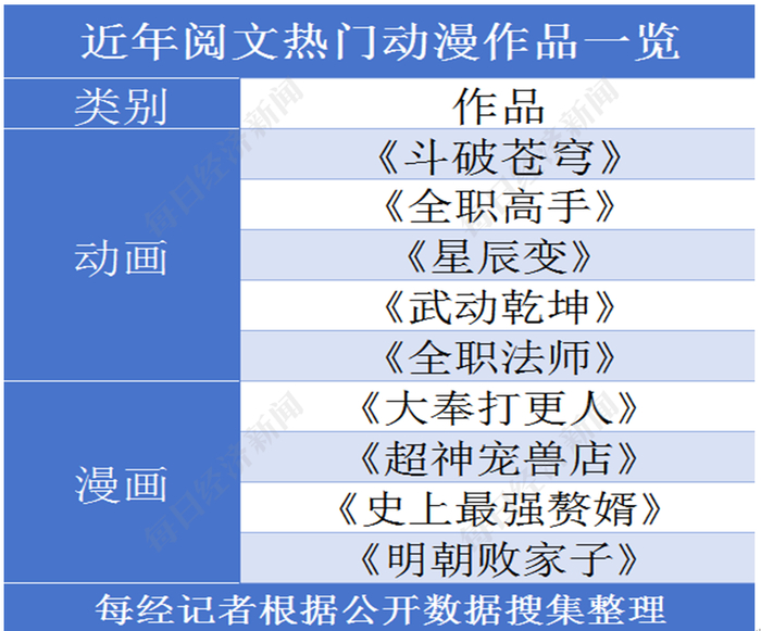 《每日经济新闻》记者统计发现,截至2023年12月11日,阅文已推出《斗破苍穹》《全职高手》《武动乾坤》等40多部题材多元的IP改编动画。