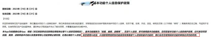 此外,该软件在向用户公示的《基本功能个人信息保护政策》中明确,使用AI功能时会单独征求用户同意:“……如您使用AI动漫、AI消除等其他附加功能或需收集敏感个人信息的基本功能时,我们会在您使用具体功能时单独征求您的同意。”