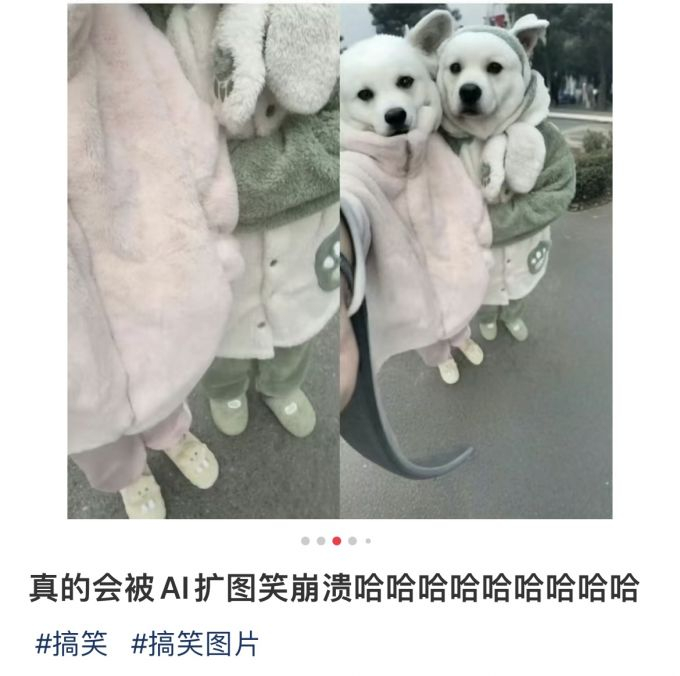 不过,更多的“AI扩图”成片却荒诞又搞笑,穿着睡衣的自拍被安上“狗头”,双人合影变三人,下半身融入自然原地消失。