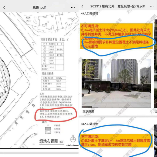在外滩玺这个项目,业主反馈种植乔木问题,招商地产对该问题的解释是因为覆土层1米厚,不符合种植大乔木的条件(总图明确绿地覆土层厚1.5米)。
