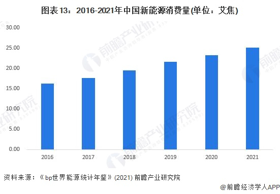 根据《bp世界能源统计年鉴》(2021)数据显示,2016-2020年,中国新能源消费量呈逐年上升的趋势,从2016年的16.2艾焦增长到2020年的23.18艾焦,复合年增长率达到9.37%。前瞻根据中国新能源行业发展态势初步核算得到,2021年中国新能源行业消费量约为25艾焦。