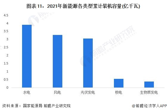 2017-2021年新能源发电装机容量呈逐年上升趋势。2021年,我国新能源发电装机容量达到11.2亿千瓦,占总发电装机容量的47.10%。其中,水电装机3.91亿千瓦(其中抽水蓄能0.36亿千瓦)、风电装机3.28亿千瓦、光伏发电装机3.06亿千瓦、核能发电装机0.55亿千瓦、生物质发电装机0.38亿千瓦。