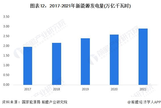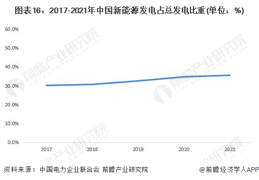 根据中国电力企业联合会公布的数据显示,2017-2020年中国新能源发电占总发电比重呈逐年上升的趋势。2020年,中国新能源发电占总发电比重为34.9%,比2017年增长了5.3个百分点;2021年,中国新能源发电占总发电比重达到35.6%,同比提高0.7个百分点。