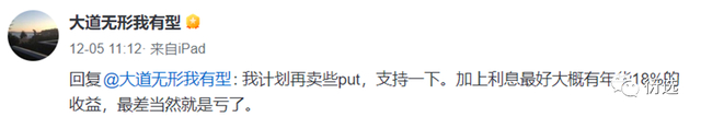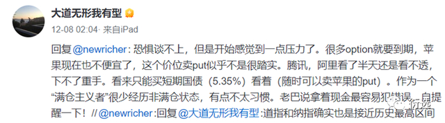 12月8日也再次表示:“恐惧谈不上,但是开始感觉到一点压力了。很多option就要到期,苹果现在也不便宜了,这个价位卖put似乎不是很踏实。腾讯,阿里看了半天还是看不透,下不了重手。看来只能买短期国债(5.35%)看着(随时可以卖苹果的put)。……”