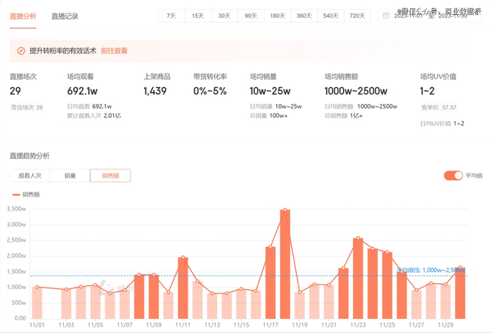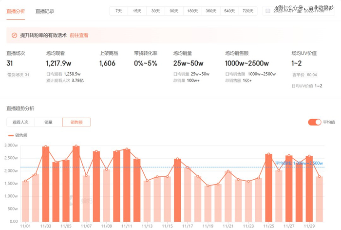 值得注意的是,去年同期的销量相对平均,而今年销量的波峰、波谷差异大。例如,11月18日的销量直接拉高了整月的业绩,高达3000余万元,该日也是东方甄选河北行主题活动。事实上,东方甄选每次举办专场活动,到本地做户外直播带货的销量,都是当月最高值。