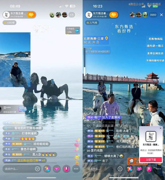 “无边泳池真的很美,我给大家游一个。”抖音看世界直播间里的顿顿和蓓蓓,一会儿在无边泳池中赏日出,一会儿在游艇中吹海风唱K,一会儿又骑上了沙滩白马......大有公费旅游、玩遍三天的态势。