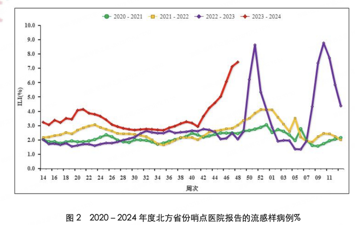 《流感监测周报》显示,今年第48周,北方省份哨点医院报告的ILI%(流感样病例就诊比例)为7.4%,高于前一周水平(7.1%)以及2020至2022年同期水平(2.5%、3.0%和2.0%)。王栩冬在访谈中表示,天津全市内科门急诊(含发热门诊)接诊量进入11月份后出现快速攀升,主要影响因素为流感病毒活跃,11月20日达高峰,目前处于高位波动状态。