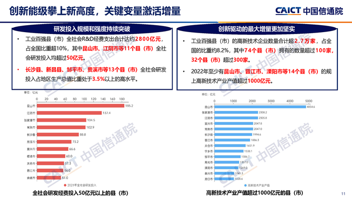 创新驱动的势能更加显现,工业百强县(市)的高新技术企业数量合计超2.7万家,占全国的比重约8.2%,其中74个县(市)拥有的数量超过100家。