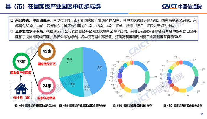 《报告》还指出,截至2022年底,主要位于县(市)的国家级产业园区共73家,从东部的县域大省-浙江、中部的县域大省-河南、西部的县域大省-四川情况来看,分布于县(市)的数量占比均超过60%。