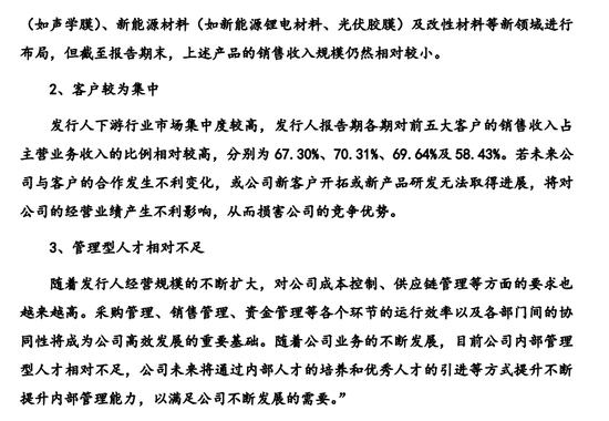 “发行人主要客户包括鹏鼎控股、维信电子等柔性线路板生产商,受下游行业市场集中度较高的影响,发行人报告期各期对前五大客户的销售收入占主营业务收入的比例相对较高,分别为67.30%、70.31%、69.64%及58.43%。若未来公司与客户的合作发生不利变化,且公司新客户开拓或新产品研发无法取得进展,将对公司的经营业绩产生不利影响。”