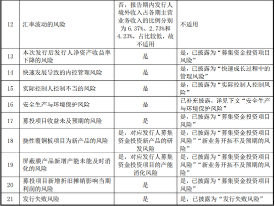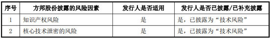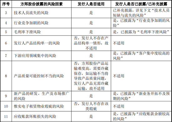 同行业可比公司方邦股份在招股说明书披露的风险因素及发行人的适用情况、披露情况如下所示: