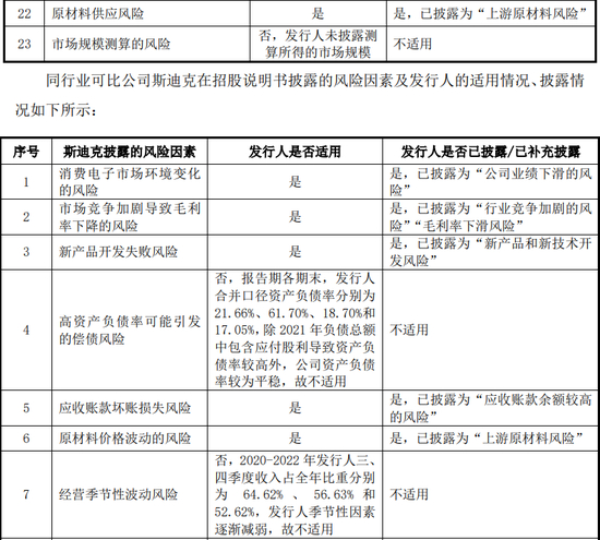 (3)发行人认为自身存在共20项风险,但在重大事项提示部分仅提示了“毛利率下滑风险”“上游原材料价格波动风险”2项风险。同时在风险因素分析部分存在如“公司通过加大产品结构调整力度及不断改进自研生产设备,使得公司毛利率水平维持在平稳水平”“发行人以销定产的业务模式,可以在一定程度上缓和原材料价格变动带来的影响”等风险对策、竞争优势表述。