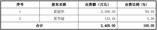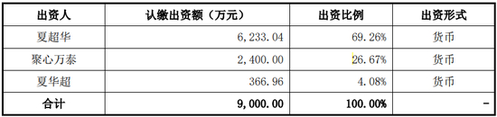 2021年4月,江苏聚心万泰企业管理有限公司(“聚心万泰”)成立,注册资本2400万元,夏超华和夏华超分别持股94.44%、5.56%,合计持股100%。