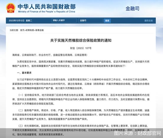 天然橡胶重磅保险政策落地实施。12月11日,财政部等三部门发布《关于实施天然橡胶综合保险政策的通知》(以下简称《通知》),明确了在海南省、云南省(统称“两省”)开展天然橡胶综合保险的基本要求、实施方案等。《通知》不仅指出两省将辖内天然橡胶种植农户和企业均纳入保险保障范围,还对承保机构作出要求,包括优化保险产品、提升服务水平等。