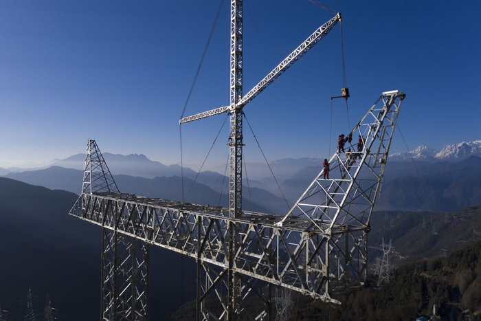12月12日,记者从国网四川公司获悉,随着最后一组横担吊装就位,川渝1000千伏特高压交流工程甘孜至天府南线路工程,顺利完成首基门型塔组立任务,这是国内首次完成“八腿式”门型铁塔组立。