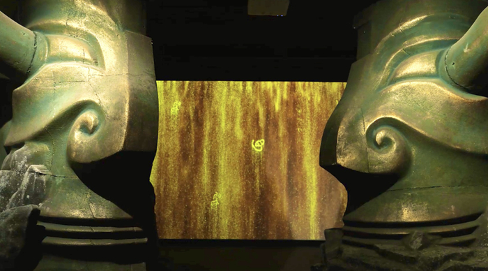 步入展览入口,数字大屏率先展示10分钟的影像内容,包括当时的祭祀场景、山洪暴发以及古蜀国环境等。观众仿佛穿越历史,身临其境地感受到那些青铜器、金器制作技艺的精湛以及充满想象力的陶器图案和符号。