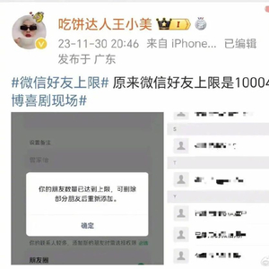 博主“吃饼达人王小美”前不久发布了一条微博声称,微信好友上限是10004个,图片显示他一个好友一个好友的加,直到被提示好友数量已达上限。这引得不少网友在评论区调侃“笑死,根本没这么多好友”“这怎么还有零有整的”。