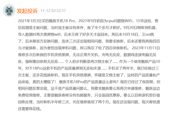 有投诉者称自己的魅族18Pro曾三次更换主板,甚至在花钱换新机后仍出现了黑屏问题。