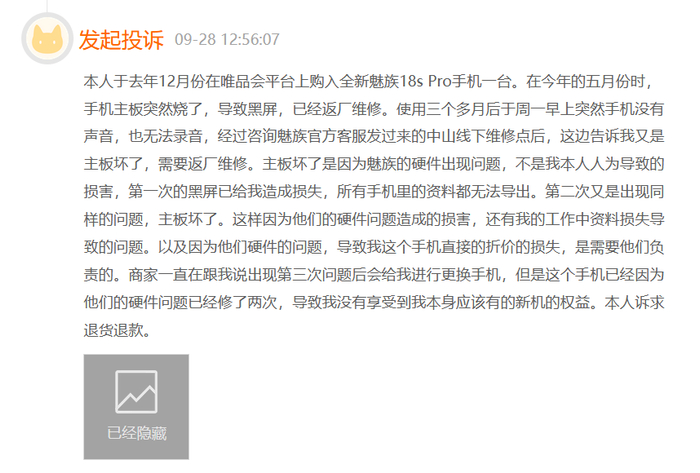 有投诉者不满魅族18s Pro主板损坏导致其工作资料丢失两次。