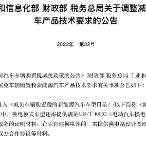 12月11日,工业和信息化部(以下简称“工信部”)、财政部、国家税务总局联合印发《关于调整减免车辆购置税新能源汽车产品技术要求的公告》(以下简称“《技术要求公告》”),明确了享受减免车辆购置税新能源汽车产品的最新技术要求。并且,自2024年1月1日起,申请进入《减免车辆购置税的新能源汽车车型目录》(以下简称“《减免税目录》”)的车型,须符合新能源汽车产品最新技术要求。