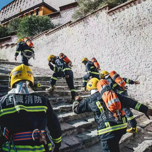 拉萨布达拉宫,消防员们背着装备,练习“冲山跑”。布达拉宫消防救援大队供图