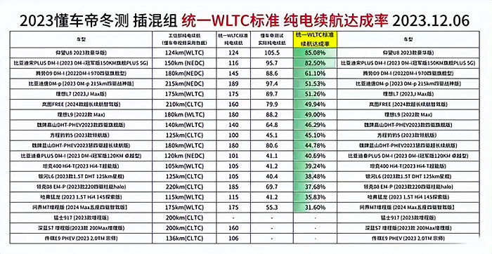 近日,懂车帝测试了在严寒情况下的混动车型纯电续航达成率,约20个车型参加测试。其中,华为、赛力斯联合打造的问界M7增程版以31.6%的续航达成率排名倒数第一,吉利、长城旗下的多款车型在测试中续航达成率均不到40%。