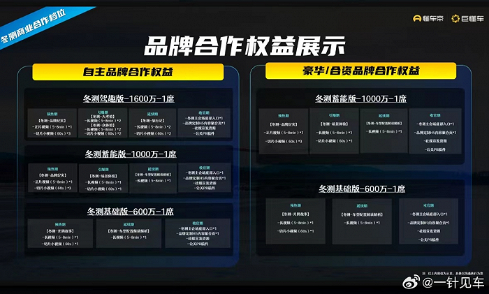 图中显示,懂车帝冬测开放的品牌合作权益分为“自主品牌”和“豪华/合资品牌”两档,自主品牌一栏,按基础版、储能版、驾趣版三类各自权益不同,对应报价分别为600万、1000万和1600万;豪华/合资品牌一栏基础版和储能版分别报价600万和1000万。