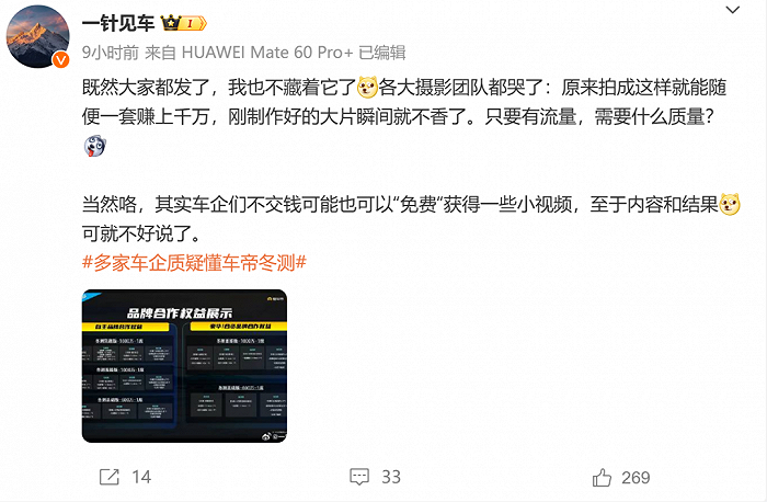 12月12日,汽车博主爆光了疑似懂车帝的冬测品牌权益表,并且发文称,原来拍成这样就能随便一套赚上千万,刚制作好的大片瞬间就不香了。只要有流量,需要什么质量?