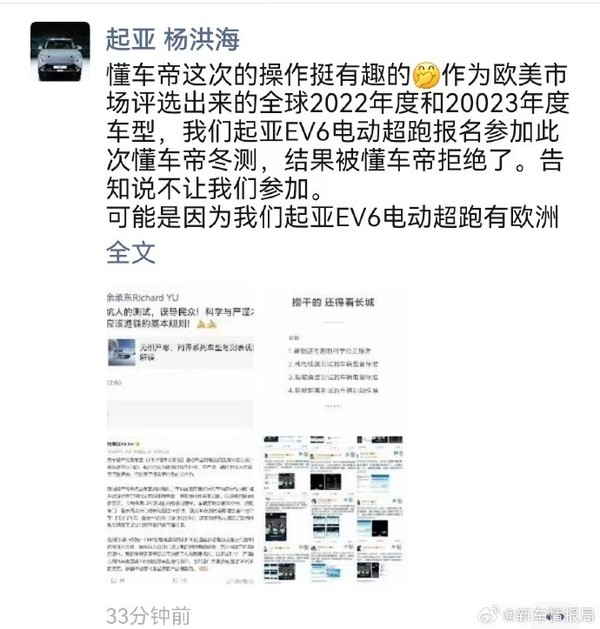 也有媒体放出了起亚中国首席运营官(COO)杨洪海的朋友圈截图,杨洪海称起亚EV6电动超跑报名参加此次懂车帝冬测,结果被懂车帝拒绝了,“可能是因为我们起亚EV6电动超跑有欧洲和美国、加拿大的严寒地区实测数据。”媒体分析,杨洪海可能暗示,由于已经存在既有数据,使得懂车帝不便进行操作。