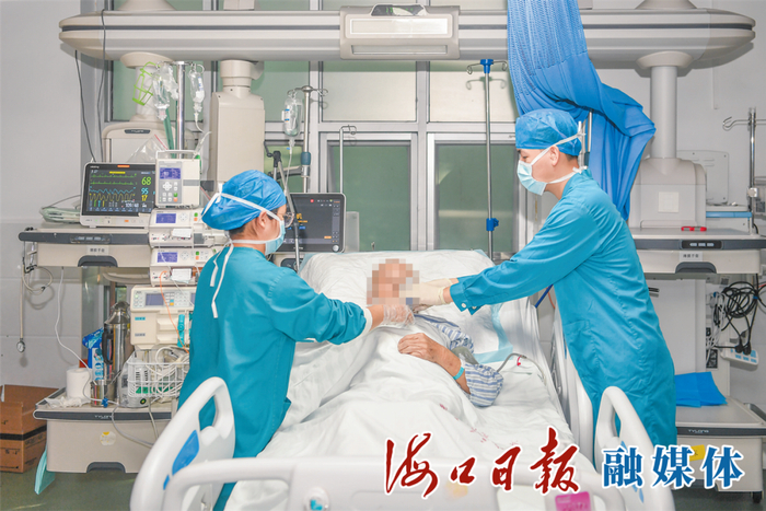 在海口市第三人民医院,来自海南科技职业大学大三学生黄远智(右),在ICU病房协助医护人员为患者进行雾化治疗。海口日报融媒体记者 孙士杰 摄