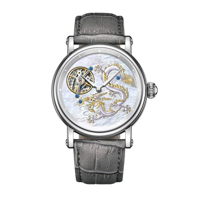 灵龙款,表盘选用银白色贝母材质,并饰有透明云纹和精美雕刻的生肖龙图腾——灵龙取色于珍珠贝母量彩,演绎灵龙在云海中翔腾的优雅之姿。玉龙款,表盘则选用深蓝色贝母材质,玉龙雕刻取色于龙泉青瓷之青,温润如水,仿佛龙威飞扬,再搭配高贵的蓝色皮质表带,展现出龙驭四海的威风磅礴。