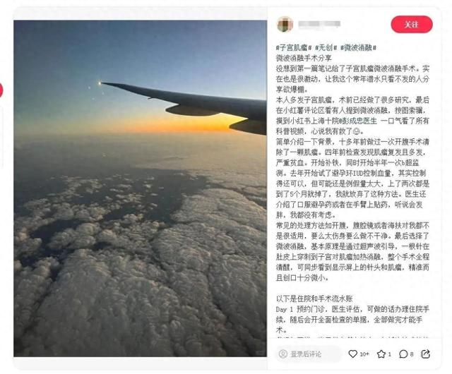 这是一则发布在某社交媒体上的感谢信。如图所示,左侧是一张拍摄于航班舷窗口的照片,右侧则是记述患者不远万里回国接受子宫肌瘤微波消融手术历程的文字……