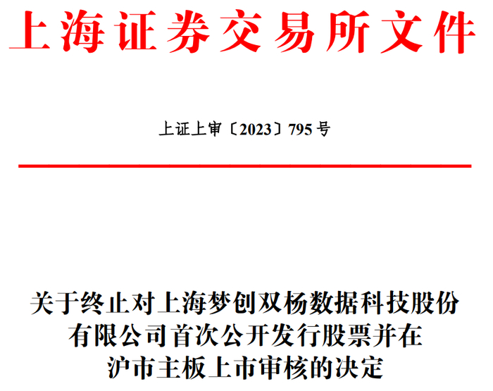 上交所于2023年3月3日依法受理了梦创双杨首次公开发行股票并在沪市主板上市的申请文件,并按照规定进行了审核。日前,梦创双杨和保荐人海通证券股份有限公司分别向上交所提交了《上海梦创双杨数据科技股份有限公司关于撤回首次公开发行股票并在主板上市申请文件的申请》(总裁办[2023]5号)和《海通证券股份有限公司关于撤回上海梦创双杨数据科技股份有限公司首次公开发行股票并在主板上市申请文件的申请》(海证[2023]1906号),申请撤回申请文件。根据《上海证券交易所股票发行上市审核规则》第六十三条的有关规定,上交所决定终止对梦创双杨首次公开发行股票并在沪市主板上市的审核。