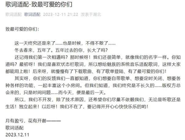 12月11日,软件歌词适配通过微信公众平台发文,向用户公告APP将永久下架。“这一天终究还是来了,也是时候了,不得不散了。”在公告中还写道“我们知道我们终究是不长久的,版权方总会来的,只是时间问题,而今天便是最后一天。”当前歌词适配APP的页面已显示“应版权方要求,App已永久下架关停,不再提供服务”。