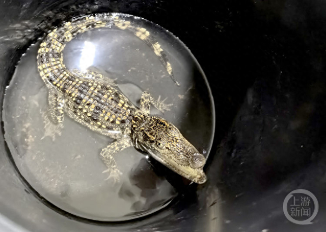民警来到现场后看到,鳄鱼被潘先生装在了一个黑色的桶里,长约30厘米,还是幼鳄,表面没有外伤,民警查看时,鳄鱼龇牙咧嘴,看上去有点凶猛。