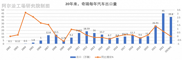 一是拉长到20年就会发现,(根据经济观察报、中国经营报等历史信息搜集到的历史信息),自2003年首次出口1200辆到2020的过去17年里,奇瑞每年出口量一直在10万辆-20万辆区间徘徊,直到最近三年,方才有重大突破。
