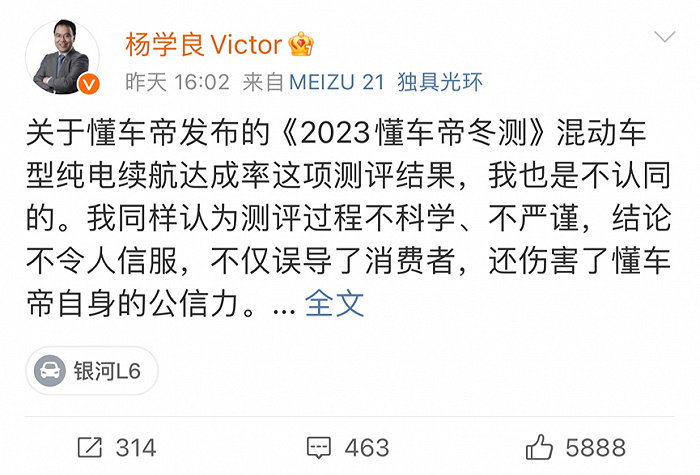 很快,当天下午4点多,吉利控股集团高级副总裁杨学良发微博:对这个测评结果,我也是不认同的。测评过程不科学、不严谨,结论不令人信服,不仅误导了消费者,还伤害了懂车帝自身的公信力。