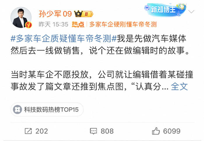 微博博主孙少军表示:他做编辑时,某车企不愿意投放合作,公司就把该车企碰撞事故推到焦点图,分析了该车如何不安全。不到十分钟,对方主动请求合作,于是公司撤下原稿,开始夸这车竞争力如何强。