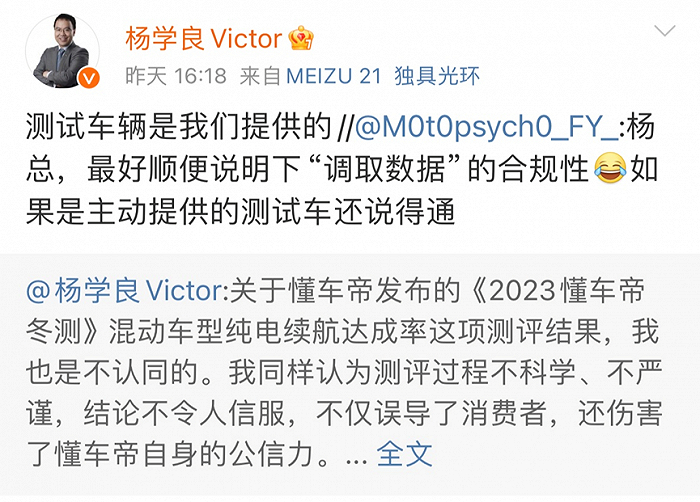 事件的余波是,起亚中国区COO杨洪海也发朋友圈:起亚EV6报名参加此次懂车帝冬测,结果被拒。在评论区他表示:就是不让我们参加,很奇怪。