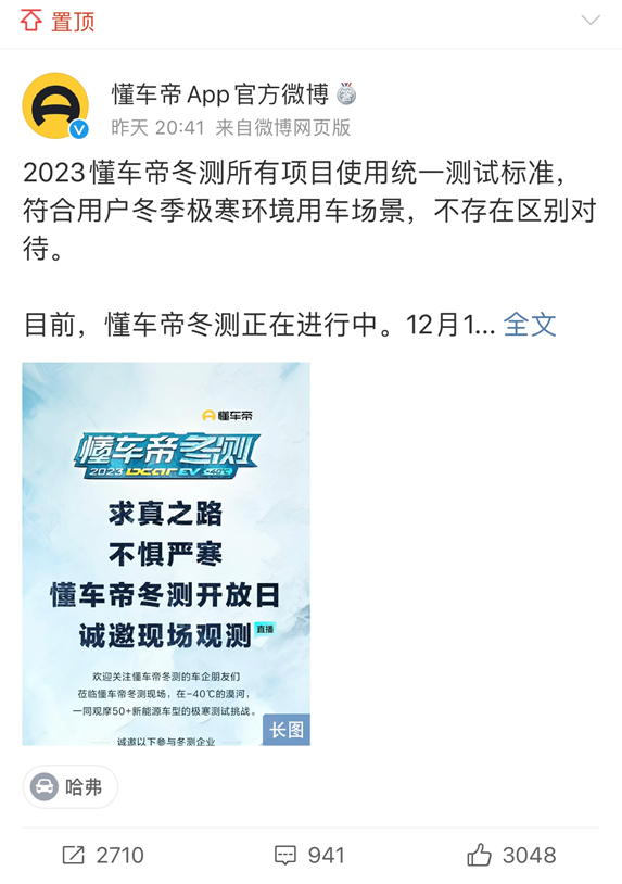 当晚8时许,懂车帝发布微博:冬测所有项目使用统一标准,符合用户用车场景,不存在区别对待。