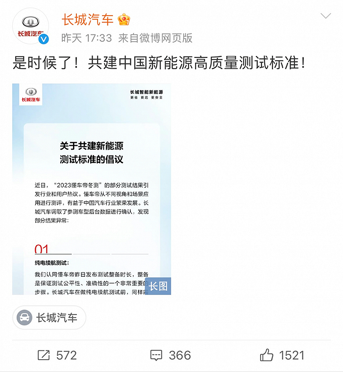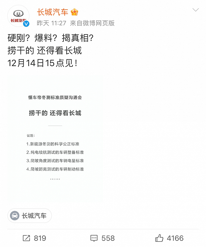 接着,12月11日下午5时许,长城汽车再发微博:关于共建新能源测试标准的倡议。共有3条质疑和建议: