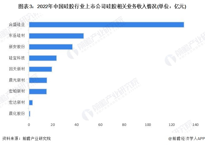 按硅胶相关业务营收金额来看,2022年,合盛硅业以130.26亿元的业务收入位列第一,东岳硅材业务收入45.98亿元,位列第二;新安股份位列第三,其余企业营收不足30亿元。