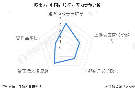根据以上分析,对各方面的竞争情况进行量化,5代表最大(竞争激烈/威胁大/议价能力强),0代表最小(竞争小/威胁小/议价能力弱),硅胶产业的竞争情况如下图所示: