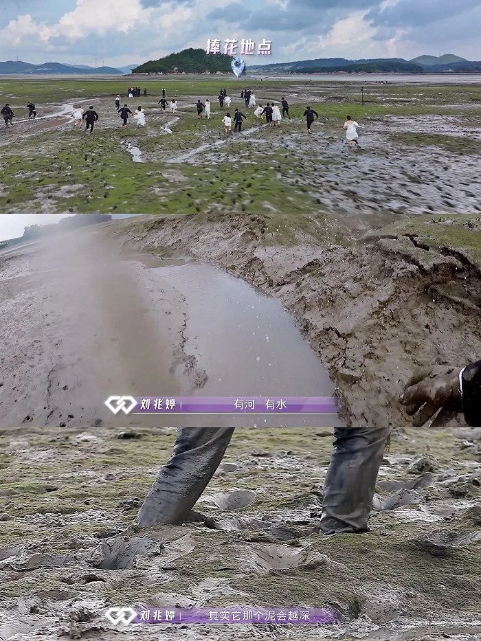 十对预备夫妻要为晋级而战,一段不短的泥潭跋涉,最开始还只是平坦的泥泞,到后半段,有河、有沙、有高低起伏,难度进一步增加。是选择折返回到终点,还是继续前进进入“直通区”进行比拼,除了体能上的比拼,还要根据自身情况进行选择路线。