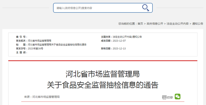河北省市场监督管理局关于食品安全监督抽检信息的通告