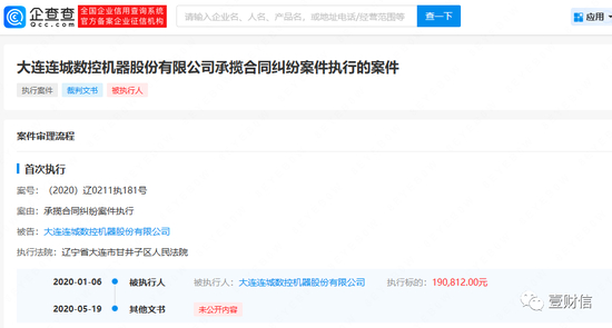除了收到大额罚单外,另据企查查,同样在2020年连城数控还因承揽合同纠纷案件被辽宁省大连市甘井子区人民法院强制执行19.08万元。